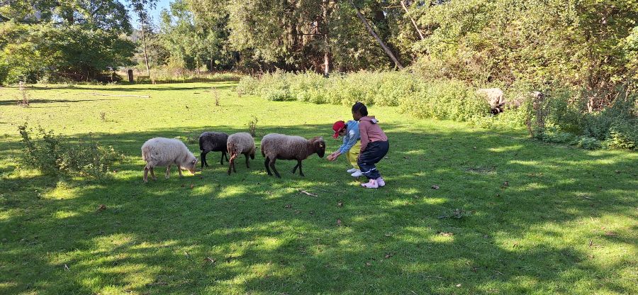 Bei unserem Besuch und bei der Begegnung mit den ausgebildeten Tieren konnten unsere Schüler ohne Zwang und Überforderung soziale Interaktionen auf natürliche Weise erleben, da das Tier dem Kind nicht bewertend begegnet und klare und vorhersehbare Reaktionen zeigt. Die Kinder haben Enten, Gänse und Pferde gefüttert, sind mit dem Pony spazieren gegangen und haben Schafe gestreichelt. Zu einem ganz besonderen Begleiter wurde nach der ersten Kennenlernrunde der Therapiehund. Die Kinder nahmen ihn stress-, und angstfrei direkt als neues Mitglied der Gruppe auf. „Hund, komm mit!“ riefen sie ihm zu.
