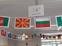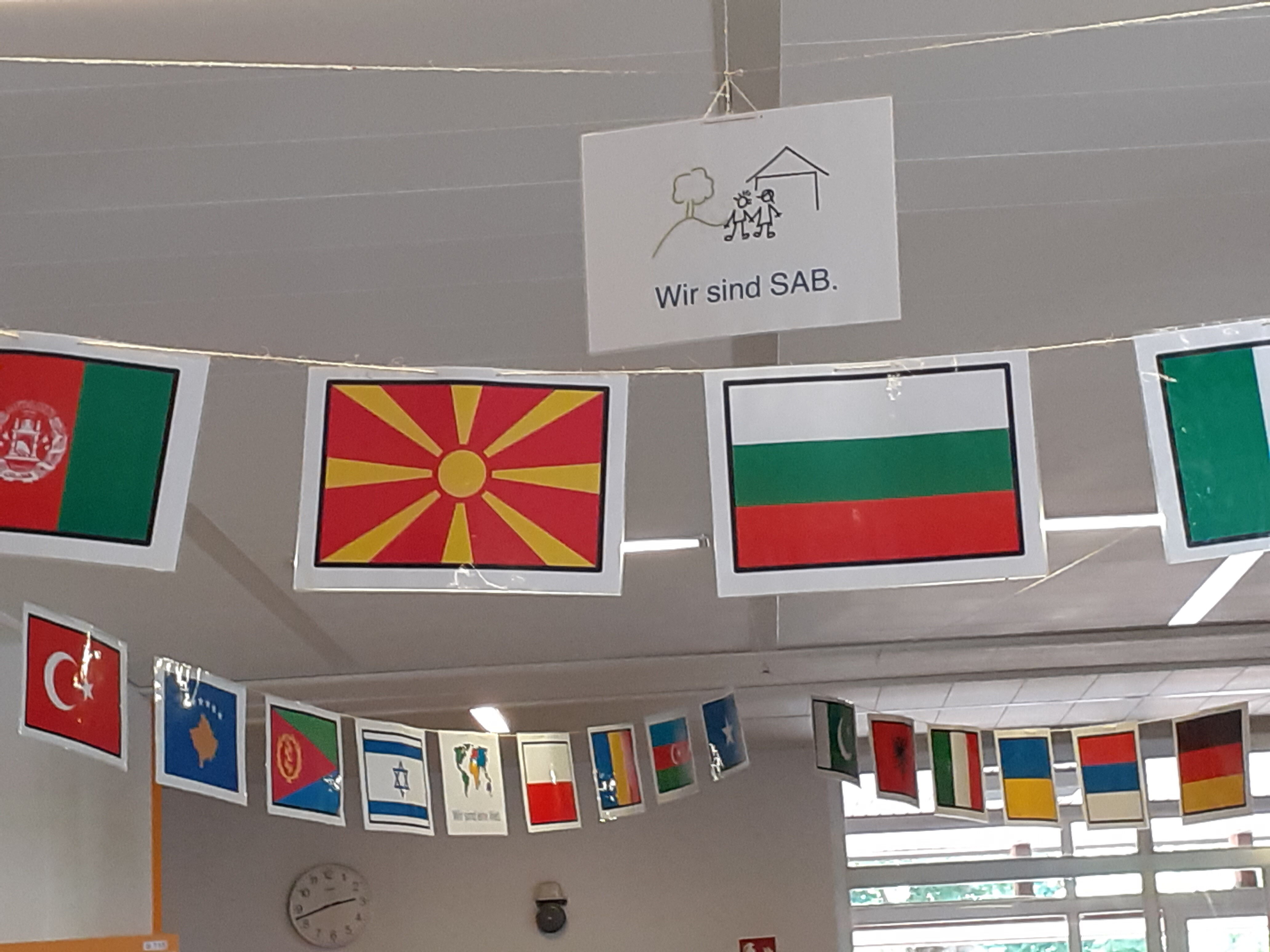 Im Rahmen des Sportfestes wurden Fahnen aller Nationalitäten der Schüler, Lehr- und Integrationskräfte zusammengestellt und in einem Einlauf zum Start des Fussballspiels „Lehrer gegen Schüler“ lautstark mit der Parole „Wir sind SaB“ präsentiert.