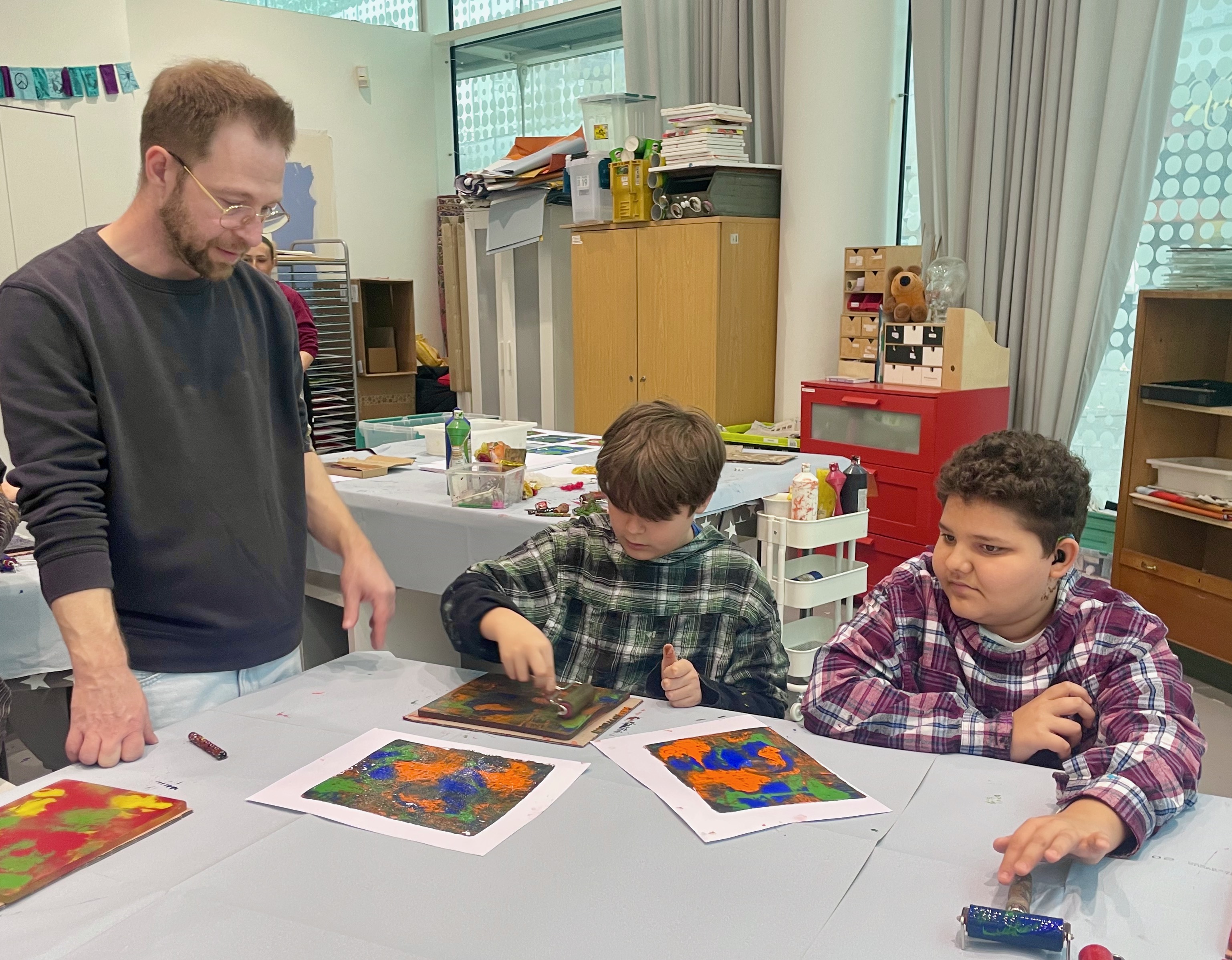 Anschließend sind wir ins Malbüro gegangen und haben selbst Bilder gemalt und gedruckt. Dafür mussten wir zuerst Schürzen anziehen.