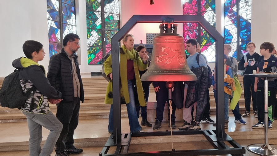 Bei einem Ausflug besichtigen die Schüler der S4 und S3 die“ Peace Bell“ des Künstlers Michael Patrick Kelly in der Jesuitenkirche. Da früher zu Kriegszeiten Glocken eingeschmolzen wurden, um Waffen herzustellen, kam er auf die Idee das Ganze umzukehren: aus Waffen eine neue Glocke zu gießen als Friedenszeichen!!!